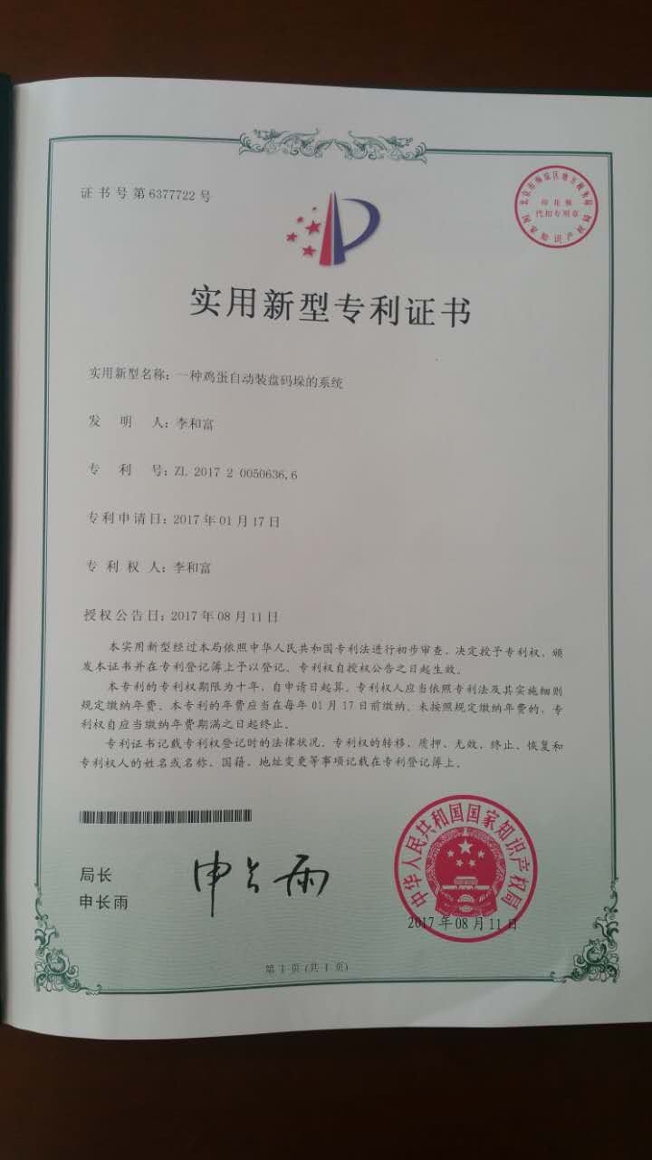 繼自動(dòng)集蛋機(jī)、雞蛋自動(dòng)分級(jí)機(jī)專(zhuān)利之后,最近兩年來(lái),我公司工程師們?cè)诳偨?jīng)理李和富的帶領(lǐng)下,不斷突破技術(shù)上難關(guān),成功研制出雞蛋自動(dòng)裝盤(pán)碼垛機(jī),并取得國(guó)家使用新型專(zhuān)利,這代表著我公司在自主創(chuàng)新的道路上又邁出一個(gè)新的臺(tái)階。